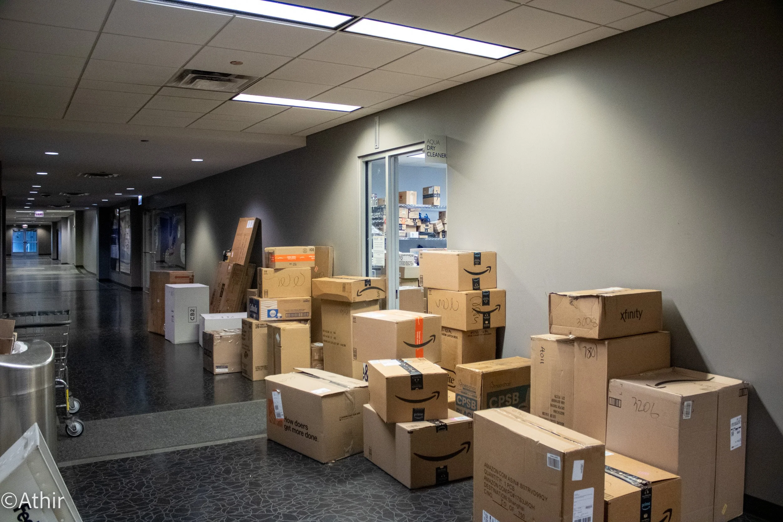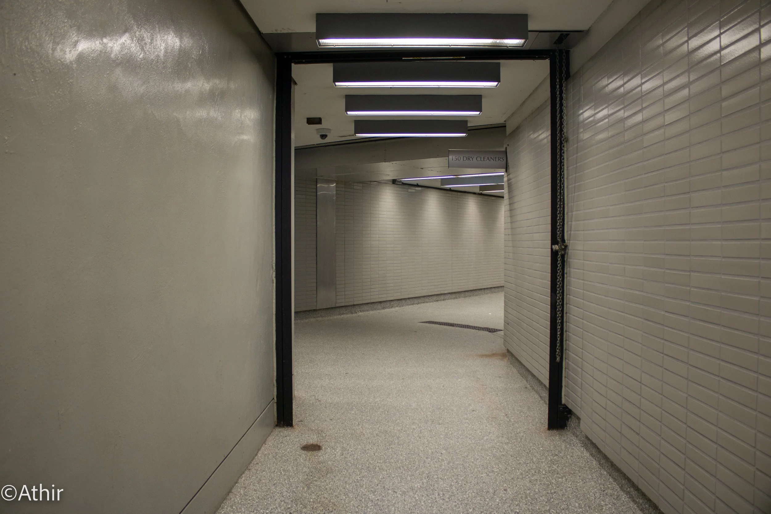 Mostly deserted, the Pedway hallway outside Jeanne Gang's Aqua Highrise Residential Package and Cleaners only receives visits from delivery personnel who leave packages outside the back entrance as the occasional pedestrian walks by Friday, Dec. 2, 2022. Chicago, IL USA. Photo by Athir.