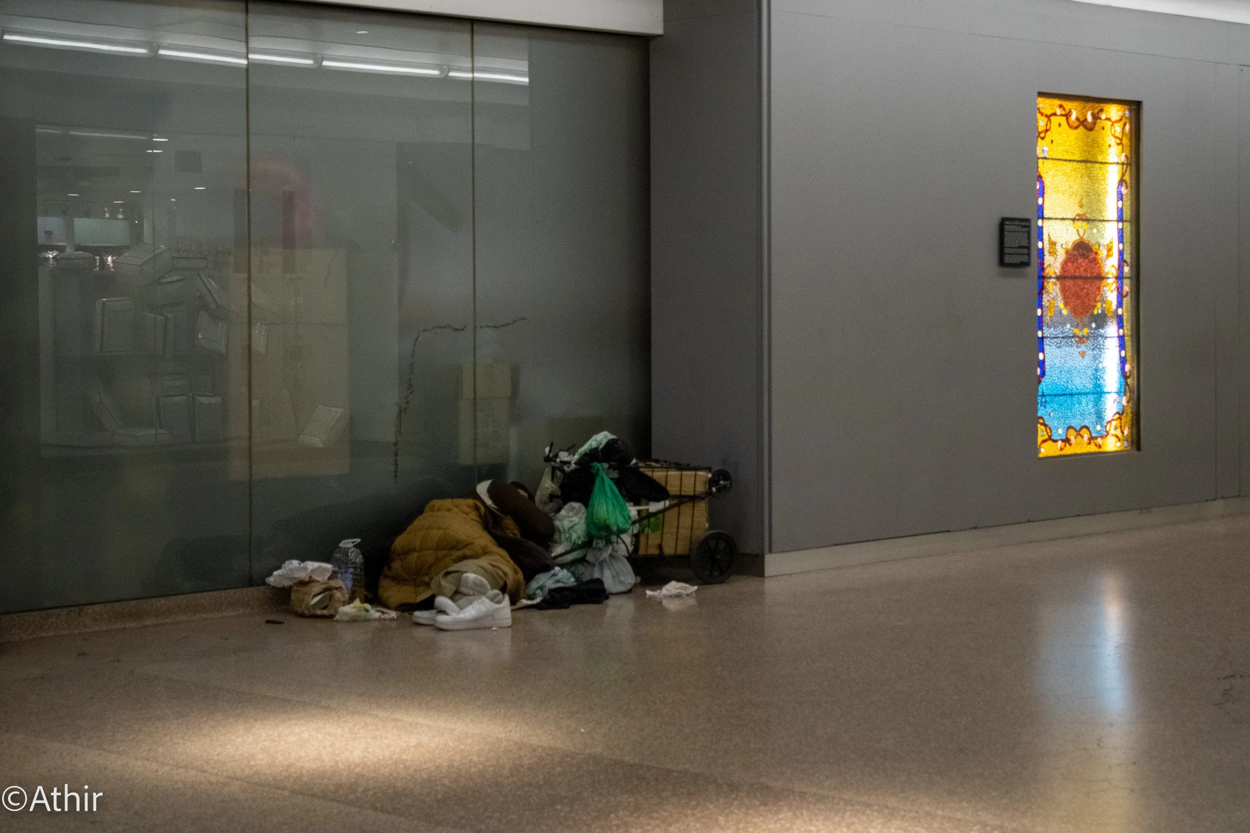 Just around the corner, an unsheltered person sleeps next to a stained glass exhibit in a lower-traffic area, but still utilized portion of the Pedway Friday, Dec 2. 2022. Chicago, IL USA. Photo by Athir.