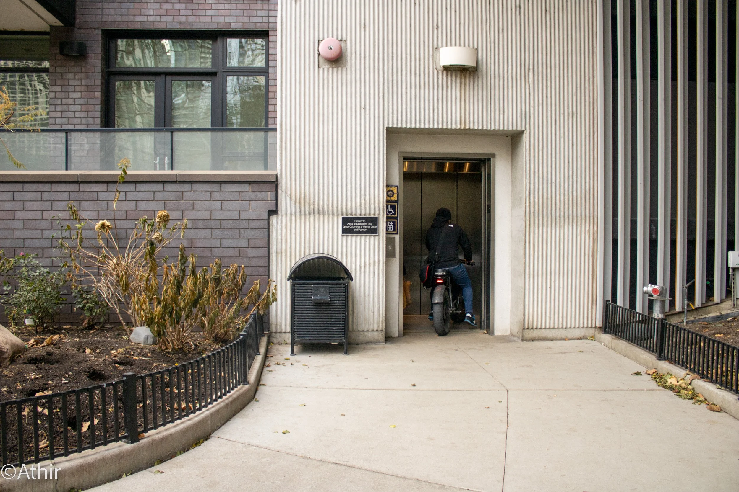 A motorcyclist enters the Pedway System using the Lakeshore East elevators, the eastern most entrance Friday, Dec. 2, 2022. Chicago, IL USA. Photo by Athir.