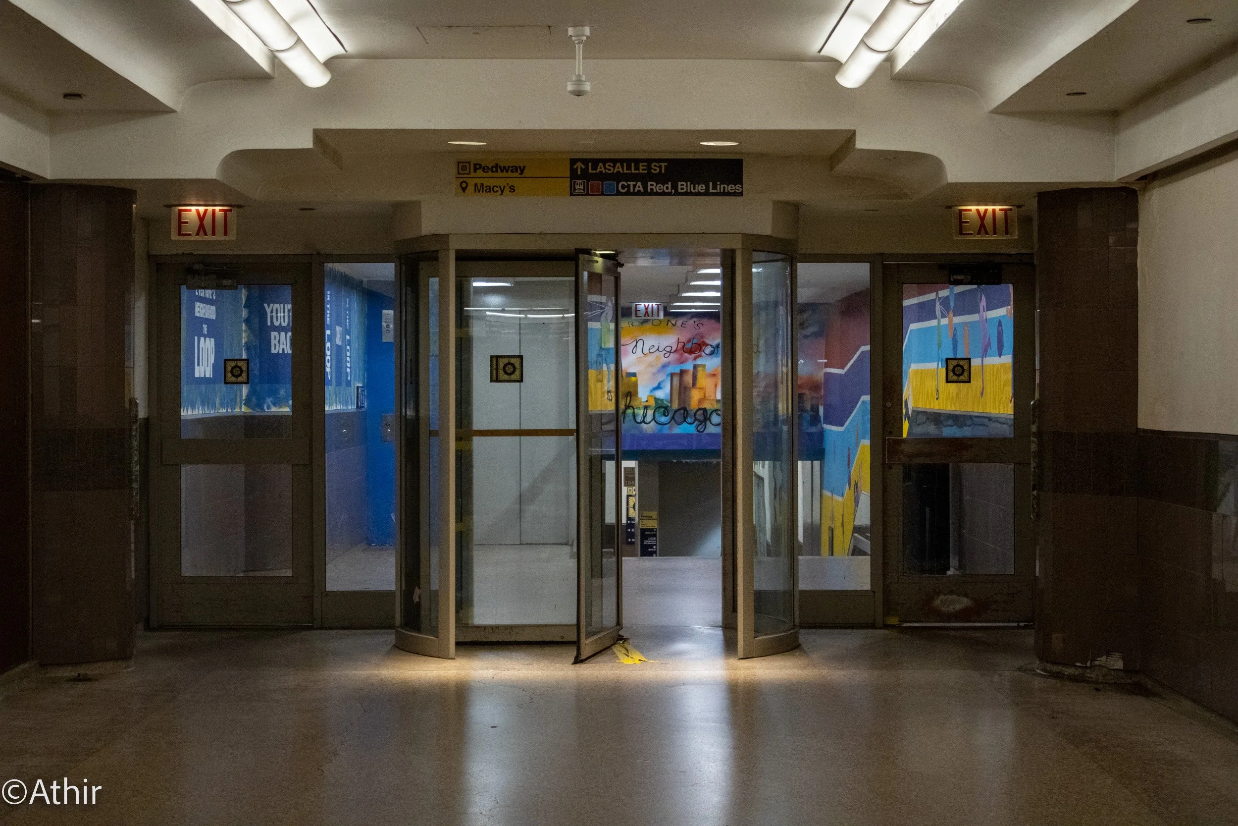 Doors, especially revolving doors, transition different areas or buildings in the Pedway. A mural can be seen beyond the revolving doors to cover an older portion of the stairwell Friday, Dec 2. 2022. Chicago, IL USA. Photo by Athir.